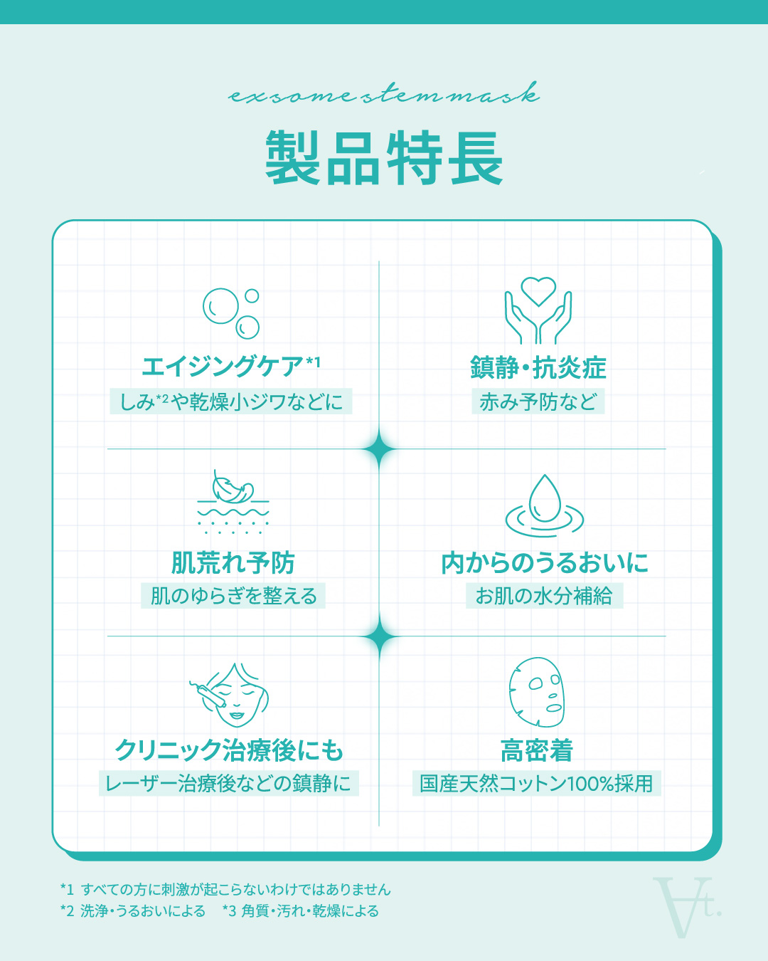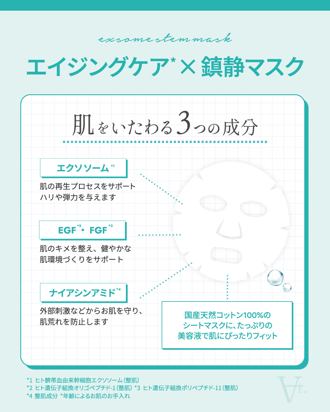 EGF・FGF・エクソソーム・ナイアシンアミド配合の美容液を、国産天然コットン100%の”ミラクルコットン”シートにたっぷり含ませたマスク。お肌に密着し、しなやかで滑らかな印象へ。