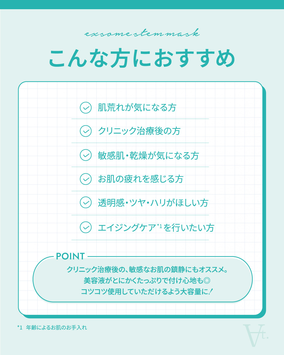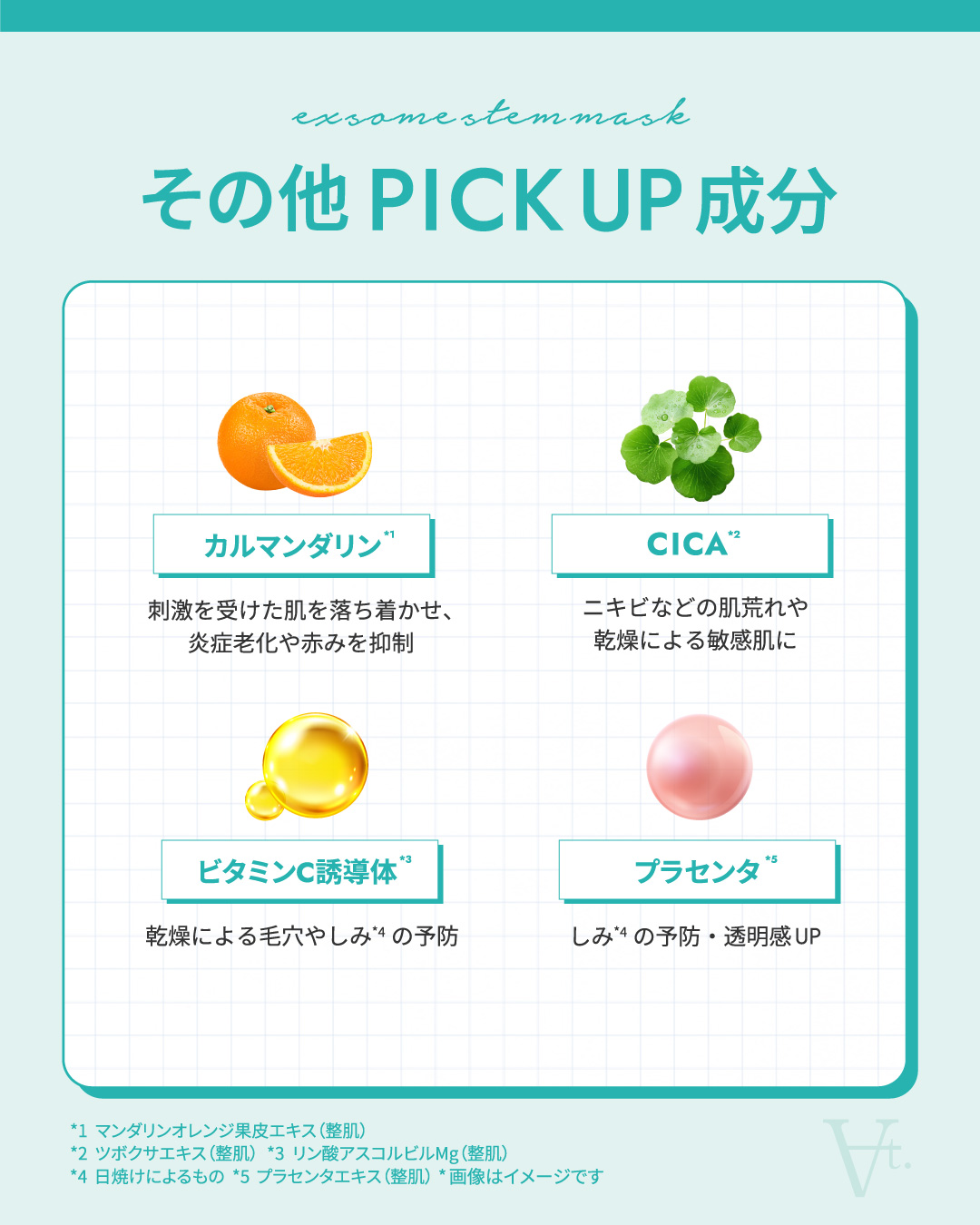 水 、BG、 グリセリン 、ヒト遺伝子組換オリゴペプチド‐1 、ヒト遺伝子組換ポリペプチド‐11 、ナイアシンアミド 、ヒトサイタイ血由来幹細胞エクソソーム 、ヒト臍帯血細胞順化培養液 、マンダリンオレンジエキス 、ツボクサ葉/茎エキス 、ドクダミエキス、リン酸アスコルビルMg 、プラセンタエキス 、ヒアルロン酸Na、 クズ根エキス 、アロエベラ葉エキス、クロレラエキス、水溶性コラーゲン 、水添レシチン、コレステロール 、ココイルサルコシンNa 、エタノール 、1,2-ヘキサンジオール、レシチン、 トコフェロール 、ペンチレングリコール 、ヒドロキシエチルセルロース 、キサンタンガム、 フェノキシエタノール、ヤシ油アルキルPGジモニウムクロリドリン酸Na 、クエン酸Na、 クエン酸【ご使用方法】