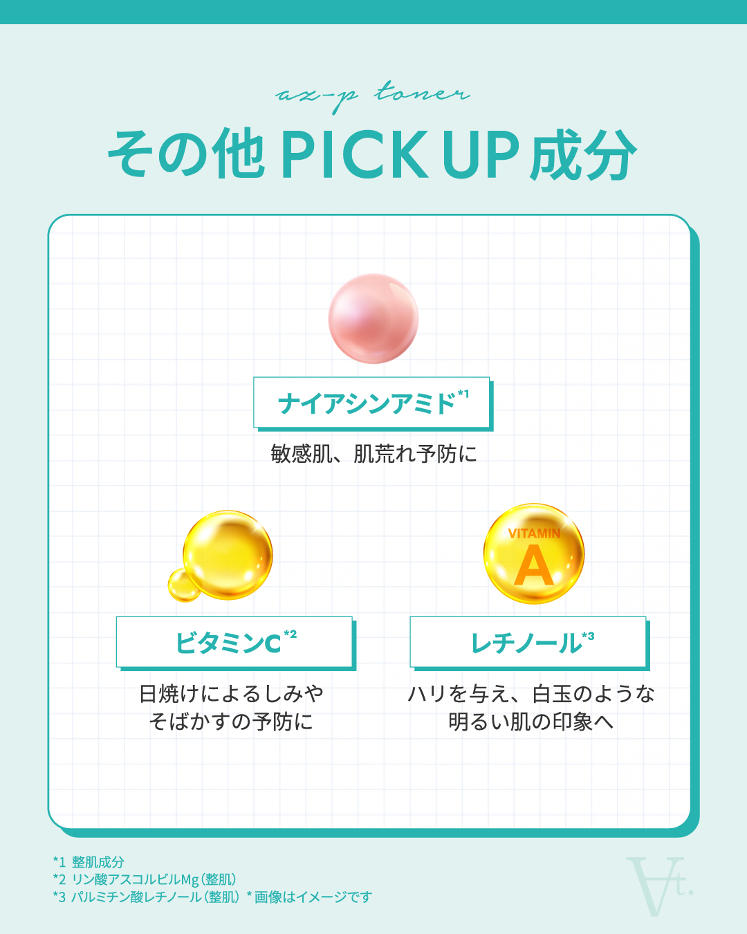 水、プロパンジオール、アゼロイルジグリシンK、BG、グリセリン、アゼラミドプロピルジメチルアミン、アゼライン酸、グリコール酸、グリチルリチン酸2K、ナイアシンアミド、クオタニウム-73、サリチル酸Na、加水分解コラーゲン、リン酸アスコルビルMg、PEG-60水添ヒマシ油、ヒマワリ種子油、パルミチン酸レチノール、コーン油、ハマメリス葉エキス、カンゾウ根エキス、ハトムギ種子エキス、セラミドNP、セラミドAP、セラミドEOP、フィトスフィンゴシン、コレステロール、ラウロイルラクチレ-トNa、カルボマ-、キサンタンガム、乳酸、エチルヘキシルグリセリン、フェノキシエタノール、1,2-ヘキサンジオール【ご使用方法】